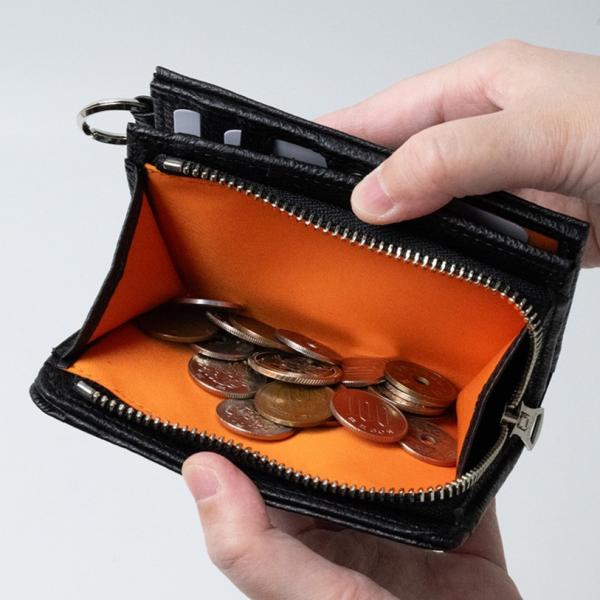 コイン収納部は、大きく開くL字ファスナー仕様を採用。中身がパッと見渡せ、会計時もスムーズに小銭を取り出せます。内装にはポーターの代名詞とも言える鮮やかなオレンジカラーのナイロンツイルを採用。視認性が高く、中身が見やすいという実用性も兼ね備えています。