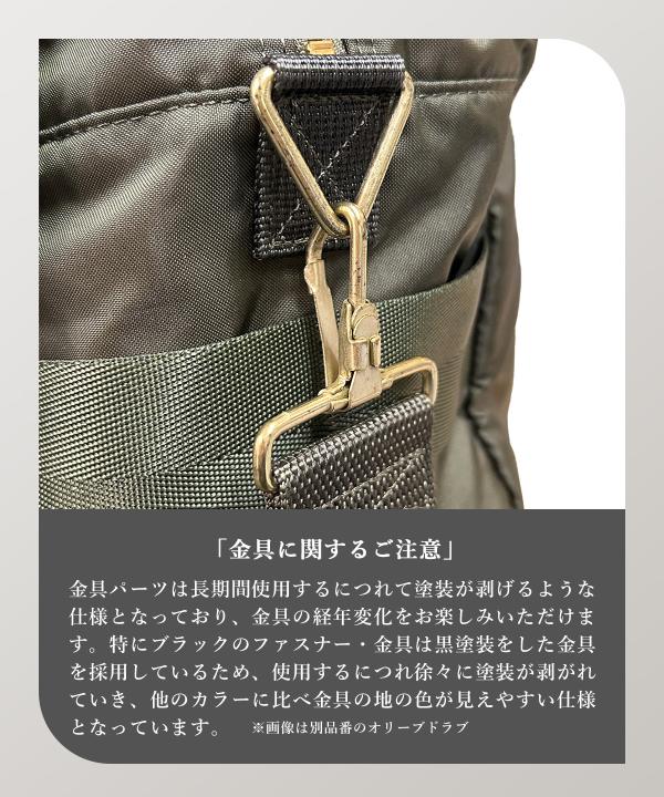 ・使用しているアルミファスナーは素材の性質上、ファスナーに引っ掛かりを感じる場合がございますが、使用回数によって軽減されます。開閉しにくいファスナーは無理な操作を避け、ロウや専用スプレーなどの潤滑剤を塗ってご使用ください。ファスナーの特性として、ご了承ください。