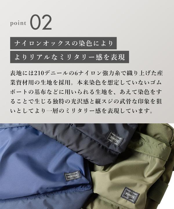 軍用品に見られる偶発的な生地色の差をモチーフに、ミリタリーテイストへのこだわりが溢れる「ポーターフォース(PORTER FORCE)」シリーズです。