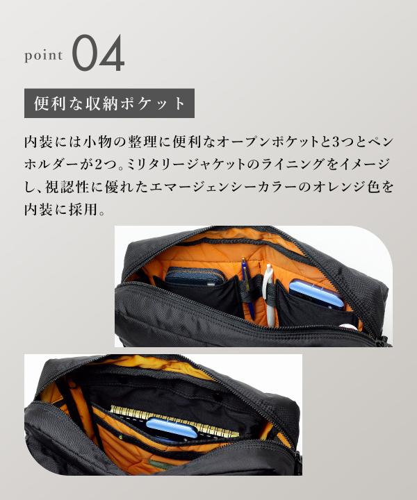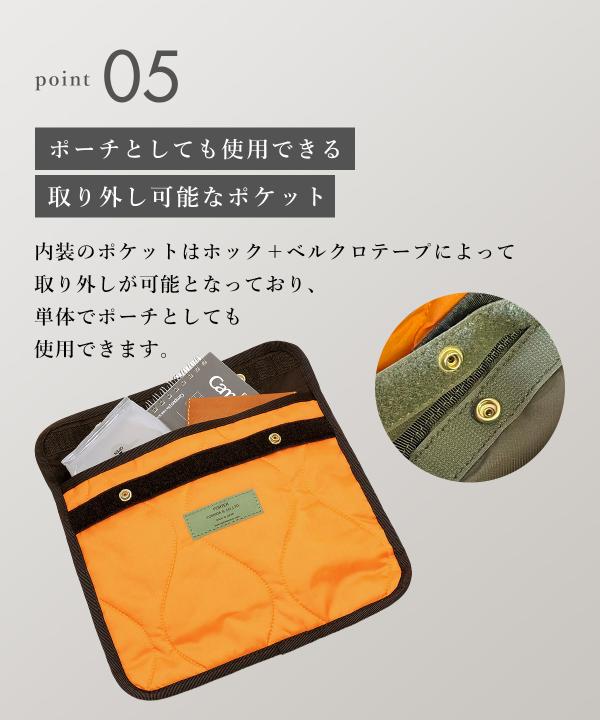 内装には小物の整理に便利なオープンポケットがあり、ミリタリージャケットのライニングをイメージし、視認性に優れたエマージェンシーカラーのオレンジ色を内装に採用。