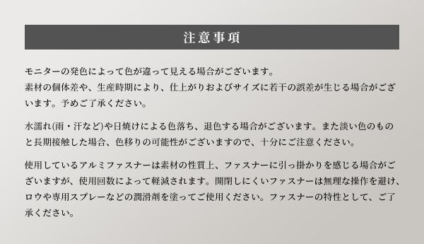 ・使用しているアルミファスナーは素材の性質上、ファスナーに引っ掛かりを感じる場合がございますが、使用回数によって軽減されます。開閉しにくいファスナーは無理な操作を避け、ロウや専用スプレーなどの潤滑剤を塗ってご使用ください。ファスナーの特性として、ご了承ください。