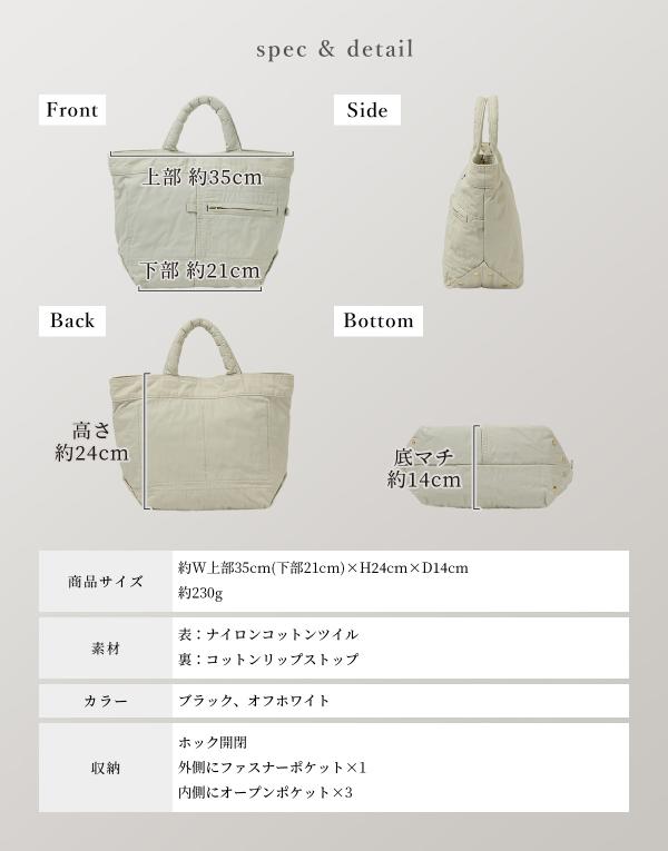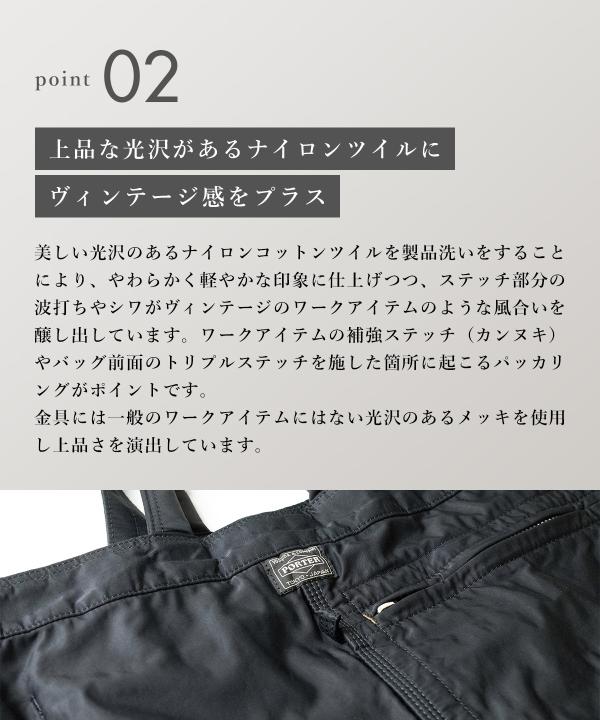 美しい光沢のあるナイロンコットンツイルを製品洗いをすることにより、やわらかく軽やかな印象に仕上げつつ、ステッチ部分の波打ちやシワがヴィンテージのワークアイテムのような風合いを醸し出しています。ワークアイテムの補強ステッチ(カンヌキ)やバッグ前面のトリプルステッチを施した箇所に起こるパッカリングがポイントです。